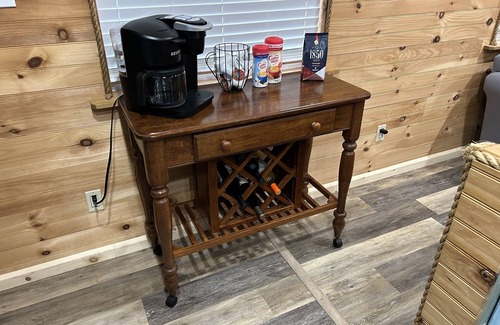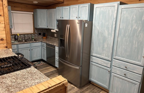 Handcrafted home designed and built by owners. Cozy living room with queen pull out sofa and leather reclining chair with ottoman. Eating table that sits 4 along with a eat in kitchen bar that sits 4.