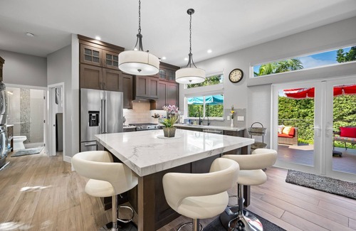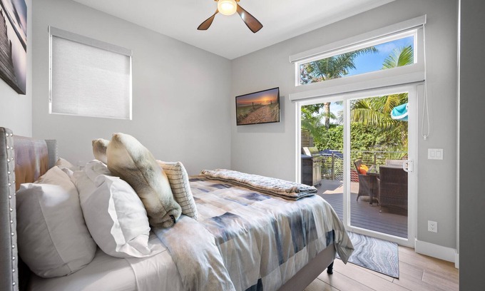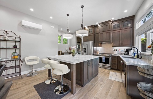 The Hideaway Junior features a thoughtfully designed space, including one bedroom and a full bathroom on the main floor. The open concept kitchen and living room area provide a modern and comfortable atmosphere. The gourmet kitchen boasts full-size stainless steel appliances, including a fridge, stove, dishwasher, and microwave. A beautiful quartz island adds a touch of elegance, making this the perfect haven for couples or small families. For added convenience, a full-size washer and dryer are provided. Both the living room and bedroom are equipped with Smart Roku TVs for your entertainment needs, including access to Hulu, Disney+, and ESPN. Ductless mini splits in the kitchen, living room, and bedroom ensure optimal temperature control. The Hideaway Junior shares a lush landscaped property with the attached Casa de Kona - Casita (Vrbo # 2084422), which can be rented separately or together as the larger Casa de Kona - Villa (Vrbo # 2084425). However, the Hideaway Junior retains its own private spaces. When you rent the Hideaway Junior, you will have a designated private entrance, a personal outdoor dining table on a private deck with a lounging area, a BBQ grill, a fire table, and a patio heater. The only shared space is the expansive grassy yard that extends beyond your deck. The maximum capacity for vehicles is 2, and street parking is available directly in front of the home.