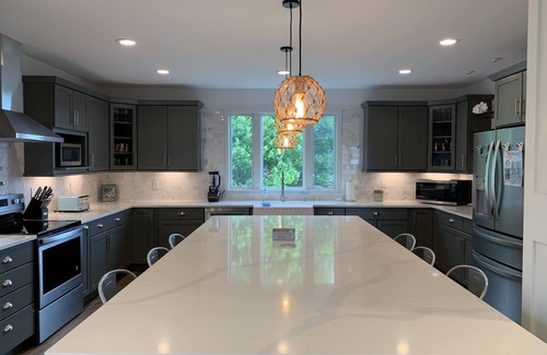 - Entertainment Ready: The fully equipped kitchen features a massive quartz island, dining seating for 20, and a cozy living room with smart TVs, perfect for entertaining guests before and after the wedding.