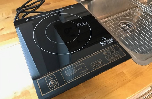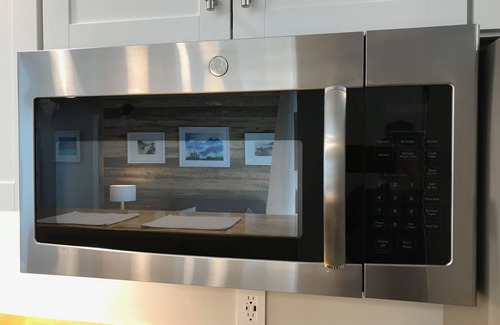 Discover culinary convenience in the well-equipped galley kitchen. Complete with a full-size fridge, built-in microwave, and a versatile Breville smart oven, this space is designed for effortless meal preparation. Cook up a storm with the included countertop induction burner and a selection of pots and pans. Enjoy dining or working at the eat-in bar, or use the portable tables in the living area. For al fresco dining, head to the deck patio area with table seating and a propane-fired BBQ grill, ensuring a delightful outdoor experience.