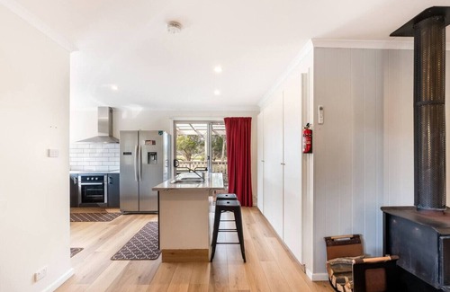 This light-filled beach house comfortably accommodates up to 11 guests across four bedrooms, making it perfect for families or groups of friends. Two bedrooms feature queen beds, offering comfort and privacy, while a bunk room with two single beds is ideal for kids or solo travelers. The larger bunk room includes two sets of bunks, one with a double bed on the bottom and a single on top, ensuring flexible sleeping arrangements for guests of all ages. The home’s layout is thoughtfully designed to balance relaxation and functionality.
