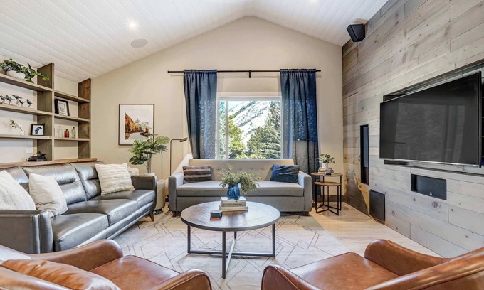 Nestle into the heart of your retreat, where vaulted ceilings, plush leather sofas, and natural light from a picture window create a space that feels both expansive and cozy. Whether you're curled up for a movie night with the immersive Smart TV and built-in sound system or diving into a game of Monopoly, UNO, or Yahtzee from the fully stocked game cabinet, this space invites you to relax and connect. Framed by warm textures, thoughtful decor, and built-in shelving, it's a gathering space designed for both comfort and entertainment.