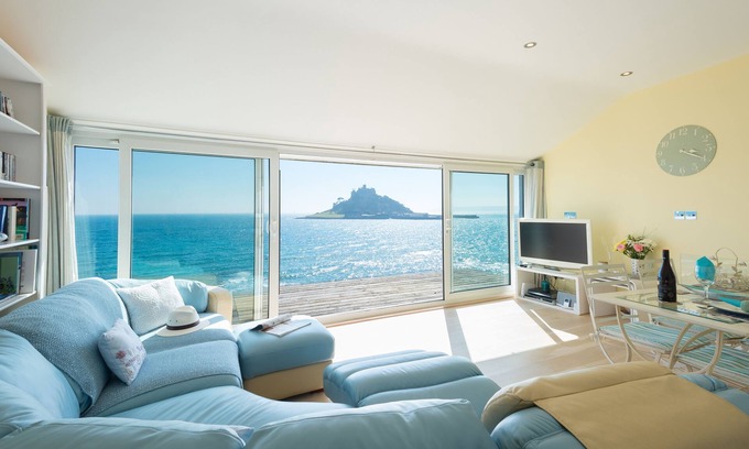 The property is beachfront, and has unobstructed spectacular sea views to The Mount - St. Michael's Mount - the beach and far reaching views over Mounts Bay – recently voted one of the most beautiful bays in the world - and the Lizard peninsular, from both inside, through the glass wall and picture windows and outside on the patio and balcony. Finished to the highest specification and fully loaded with quality appliances, a luxury bathroom with separate double rain shower and Jacuzzi bath, solid oak flooring through out, a full SKY HD package with sports & movies & BT Sport. BT Infinity 2 internet with Wi-Fi, a Bose docking station, a Roberts internet radio and a 5ft four poster bed . The open plan living room with luxury fitted kitchen is the centre of the house and revolves around the stunning wall of glass looking directly at the iconic St Michael's Mount. It is within 4 minutes direct access to the Blue Flag beach, dunes, & amenities. Activities include fishing, swimming, sailing, surfing and kite-surfing, cycling, walking or rambling and bird watching at Marazion Marsh RSPB Reserve , visits to Historic houses and enchanting gardens. It is a perfect escape for a honeymoon, romantic long weekends, retirement and OAP short breaks. There is something for everyone. The inviting waves rhythmically land onto the expansive, soft sand beach, in a moon shaped World Heritage bay, with dramatic cliffs and heather and the majestic and magical castle standing proud. What better way to soothe away the stresses and strains of everyday life, stirring contrasts of both, zen and peace into body, souls, mind and spirits.