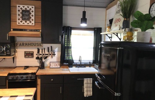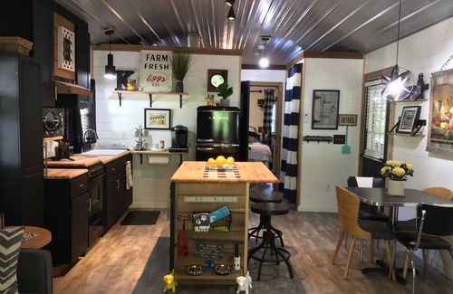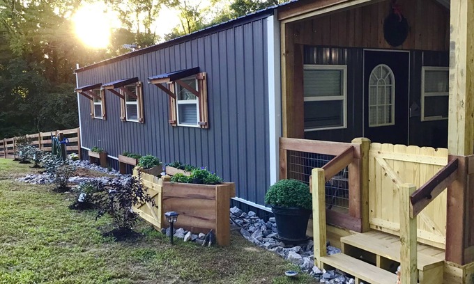 Coco's Cabin is 504 sq. ft, where your fur babies stay free , open floorplan , the kitchen has everything you need, retro appliances eat-in bar area and retro kitchen table, microwave, keurig coffee maker, regular coffee maker, toaster pots, pans dishes pantry etc and living room area includes a queen sleeper sofa, bathroom has large Shower with sliding glass doors, vanity with all supplies including hair dryer, across the hall washer and dryer. Separate bedroom-with King size bed, nightstands have lamps with built in chargers for your phones to charge, bedroom has a fireplace and a tv, a reading nook to relax with a good book, bedroom has blackout blinds and curtains for a restful night sleep The outside deck is large and faces the private woods, it has several sitting areas, and it has a nice grilling area. The back deck is fenced for your pets safety, it has a gate on each end of the deck and if you open one to yard he can go from deck to yard, the yard includes a sitting area for you to relax and you can watch fur babies play or just relax.