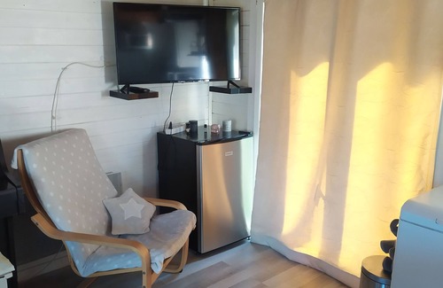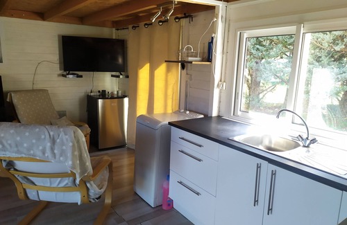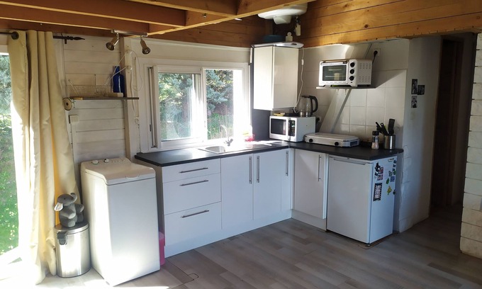 Upon entering, you'll find yourself in the main room, which encompasses the living area and the open kitchen. The living room is equipped with portable air conditioning for added comfort. It features a table and four chairs, perfect for dining or enjoying a meal. Entertainment options include a TV with access to YouTube and Netflix via Wifi (please note that there is no internet box, and access to applications is available through connection sharing). Additionally, you'll find two cozy armchairs and an upright piano, offering opportunities for relaxation and music.