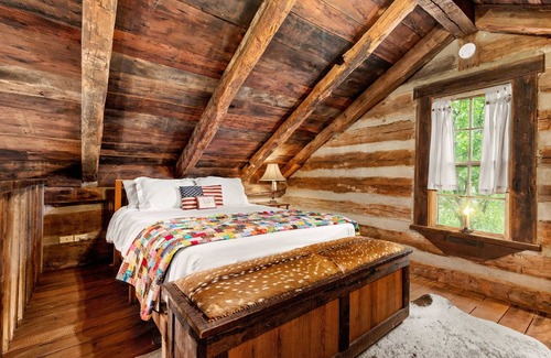 Coco’s Cabin is a 2 story log cabin built in the 1850’s and completely restored, it is a 1 bedroom loft with kitchenette and full bathroom with copper bathtub and walk-in shower. The living room is furnished with beautiful leather furniture, grand fireplace (we provide one firelog per each night stay) blankets and 38inch tv.