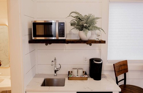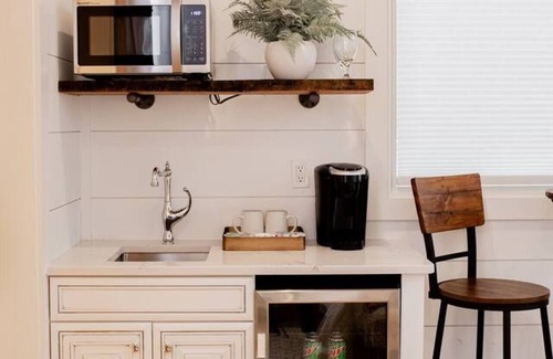 Whether you are extending your stay from attending an event at The Artisan, seeking a romantic remote destination getaway, or getting a group together for the weekend to experience the many activities in the area, the tiny homes have it all and more. Drawing inspiration from our rich French country heritage, these luxurious suites are sure to impress! Features include white planked oak floors, shiplap walls, white marble tiled bathrooms, floor to ceiling windows with flowing curtains, pops of color and charming chic décor throughout. Accommodating up to 17 guests across all 5 tiny homes, you will have your chose of four romantic 1-bedroom suites or one large two-story that sleeps 9 comfortably. Each home has its very own on suite with wet bar, refrigerator, Keurig, and microwave. Sneak away as two for the weekend or rent out all the tiny homes for an intimate weekend among friends and family. There is not a detail forgotten! The farm is your perfect place to stay. Book your tiny home today!