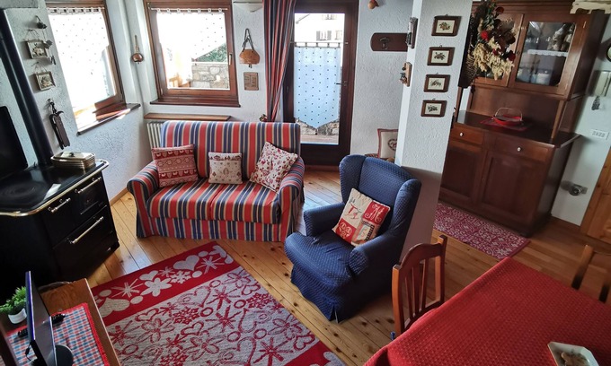 The accommodation is located on the second floor and offers a kitchen equipped with all the essentials, a comfortable dining table, and a living room with a sofa bed and wood-burning stove. Upstairs there is a double bedroom with two single beds, a second bedroom with a single bed, and two bathrooms (one on each floor), one of which has a shower. The apartment is always very bright thanks to its southern exposure, and boasts two outdoor balconies, perfect for enjoying the fresh air and breathtaking views of the Gran Paradiso glaciers.