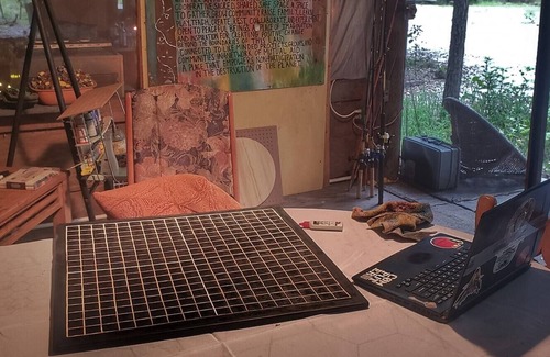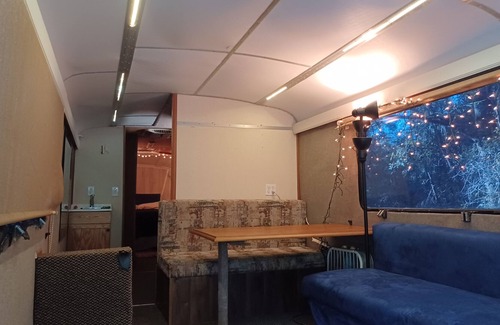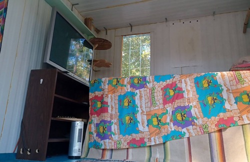 Queen sized bed in the back with A/C, heat, and skylight. Sink, toilet and hot shower, and a table and living room with couch. Perfect place to sleep comfortably and chill away from the raw power of nature. Just 100 feet from the kitchen and communal space, and 3 minute walk down to the lake and pond.
