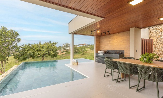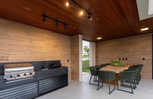 The Raiz da Serra IV Condominium in Gravatá combines facilities, leisure and elegance in a single place. The privileged topography of the slope into a valley of immense proportions allows our Concept House to enjoy a unique view. Built on a plot of 727.48 m2, with 232 m² spread over two floors, the High Standard house accommodates up to 10 adult guests. Perfect for those looking for an exclusive getaway with comfort and nature.