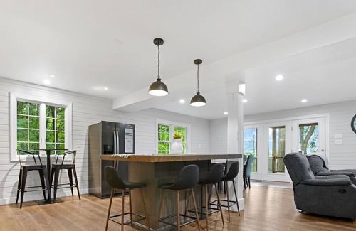 Step into your private oasis in nature! This incredible cottage greets you with a seamless open-floor plan, a spacious living room with an indoor fireplace, a gorgeous dining room table and fully-equipped kitchen (the chef in your group will thank you!), and the best part... the game room! This finished garage turned game room is a highlight of guests for good reason! Get ready for family game nights, cozy movie nights, and days of exploring this incredible property!