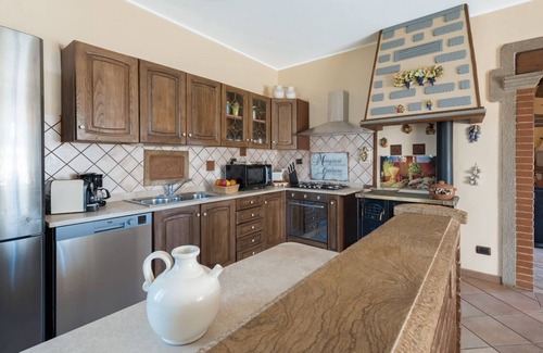 Fully-equipped, island unit, dishwasher, additional old-style stove, 5 gas hob rings, large fridge & freezer, glass cabinet, dining table with 6 chairs.