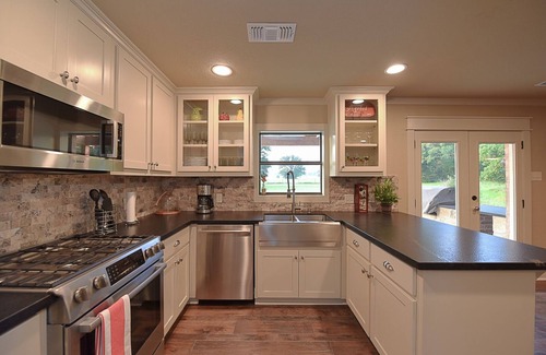 This new B&B home is a 2,100 square feet with 3 bedrooms that can be rented by the entire house or per bedroom suite. This A-Frame farmhouse has just been completely renovated, including new furniture and linens, located in rural south College Station. You will experience all of the amenities found in an upscale hotel in this intimate setting. The home is located a mile from the new Tower Point shopping center and a few miles from Texas A&M University. Each of the three bedrooms has a different theme with king or queen beds. The great room opens into the fully equipped kitchen and dining area. Two large leather sleeper sofa's and recliners make a nice atmosphere to sit and talk, watch TV on the large flat screen, or enjoy the wood burning fireplace. Enjoy the end of a day grilling on the outdoor kitchen or sitting around the fire pit while taking in the country side and wildlife. Washer and dryer available onsite. Breakfast will not be served if the house is rented as a whole.