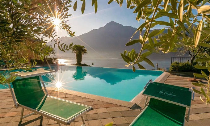 "La Collina" consists of two holiday homes with different sized flats and a pool bungalow. The two holiday homes are offset to the side - with a wonderful lake view.Your pool bungalow is on the side, below the pool with a beautiful outdoor area with garden set and sun loungers: Private garden area at the entrance with covered terrace facing the lake. The Mediterranean planted communal garden with solar heated pool, children's pool and children's play equipment. with numerous places to relax. Both the garden and the pool area offer all kinds of opportunities to enjoy the