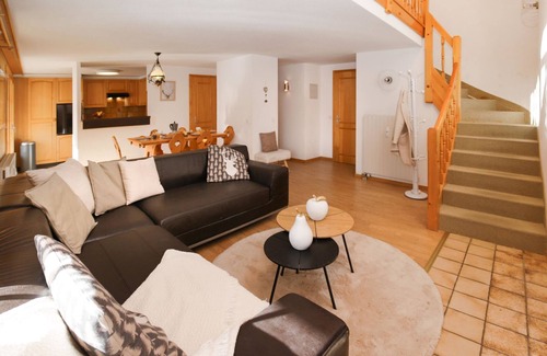 "Colline 8", 4-room apartment 150 m2 on 2 levels. Comfortable and tasteful furnishings: living/dining room with open-hearth fireplace and cable TV. Exit to the balcony, south facing position. Open kitchen (3 hot plates, oven, dishwasher, raclette grill, fondue Set (cheese)) with bar. Sep. WC. Upper floor: 2 rooms, each room with 2 beds (90 cm, length 190 cm). Exit to the balcony, north facing position. 1 room with 1 french bed (1 x 160 cm, length 190 cm), bathroom. Exit to the balcony, south facing position. Open gallery. Shower/WC. Balcony 20 m2, south facing position balcony 15 m2, north facing position. Balcony furniture, deck chairs (3). Marvellous view of the lake, the mountains and the resort. Facilities: children's high chair, baby cot. Internet (WiFi, free). Parking at the house. Please note: non-smokers only. Maximum 1 pet/ dog allowed.
