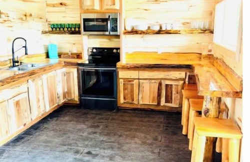 Our cabin has 3 bedroom, 2 baths. The main level houses the master suite with jacuzzi tub, living room, kitchen, and closed in porch as well as a deck that expands the entire length. The lower level houses a bed room with a queen bed, another bedroom with full bunk beds, full bath, full kitchen and living room with walk out to the lake and hot tub. Experience a true log built cabin with refurbished wood products, hand crafted counter tops, cabinets and beds.