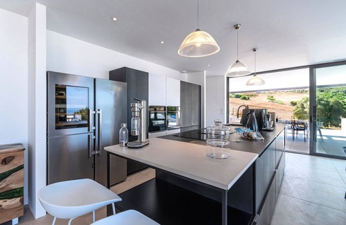 - A fully equipped kitchen with: two refrigerators and freezers with wine compartments, electric kettle, oven, microwave, toaster, dishwasher, and stovetop