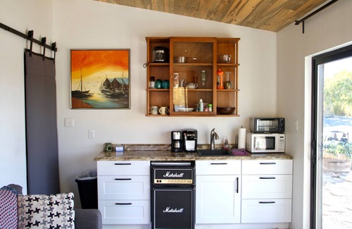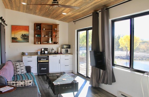 This modern newly built custom one of a kind guest house located on the banks of the Colorado river in Palisade wine country. Spacious 1 bedroom 1 bathroom attached to property owners house has a comfortable king bed and comfortable sofa bed, small kitchenette, steps from the Colorado river float from Riverbend park in Palisade to the house w its private beach, large fishing lake, working farm, animal sanctuary for alpaca, goats, pigs,dogs,cats, chickens, peacocks even a emu that all free range the property.