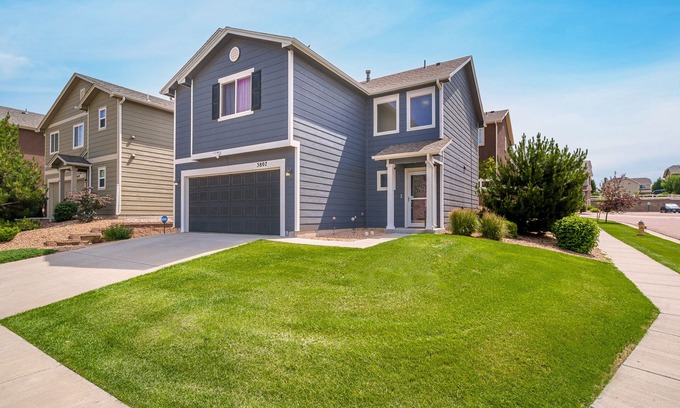 Situated on a sunlit corner lot, the house offers immediate access to trails within the neighborhood. This two-story residence features three bedrooms, 2.5 bathrooms, an attached two-car garage, and stunning views of Pikes Peak and the Frontal Range from the primary bedroom, the living room entrance, and the west-facing windows.