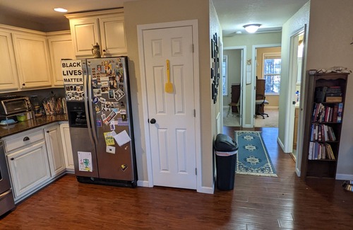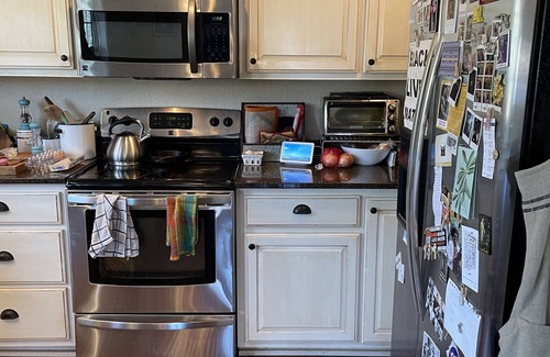 Master bathroom has a king sized bed, walk in shower and double sinks. The living room is inviting with plenty of seating for movie watching or book reading. It is adorned with cozy house plants, art, and a smart tv. Since we live here we have lots of books around for you to enjoy- just please don’t take them with you when you go. You’ll find that this is our actual home so we have photos of our friends and family as well as art and decor that is not quite generic- some might even say funky.