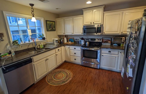 Large kitchen table for dining. Stainless steel appliances. Lots of kitchen items including pots and pans, plenty of dishware, blenders, spices etc.