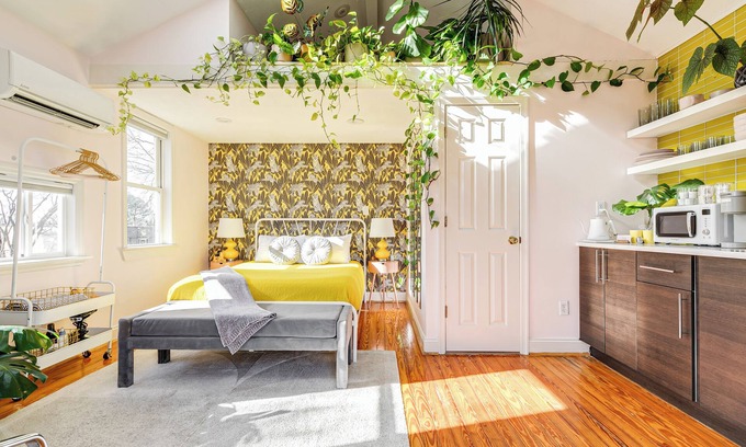 This unique place has a style all its own with carefully curated touches of yellow! A private guesthouse tucked away and at the top of a spiral staircase. This space is a five minute drive from Richmond's most popular neighborhoods. Fully equipped with a mid-century modern kitchenette, private patio, and A/C! This space is an experience in itself. Explore Richmond's best kept secret; the Yellow Tiger's Den. Hosting for 3 years on other platforms, excited to start on VRBO.