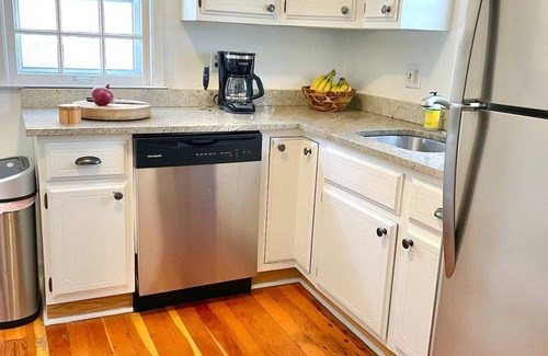 The dining room table has seating for 4, but the leaf allows comfortable seating for more. Additional dining chairs and a highchair are available if needed. Off the dining room is the kitchen, complete with gas range, microwave, coffee maker, blender and fully stocked with supplies to cook any meal you can think of, variety of additional small appliances also available for use.