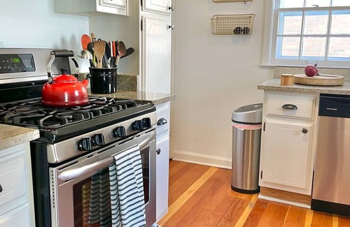You are going to love the charm and comfort of our home. You’ll be located on a quiet tree lined street in a walkable neighborhood, close to restaurants, grocery stores and coffee shops. Street or driveway parking makes arrival a breeze. The main level of the home boasts 2 bedrooms, one of which can also serve as an office with a dedicated workspace. The master commands the entire upper level of this Cape Cod style home. The deck is a perfect place to unwind in the fenced backyard.