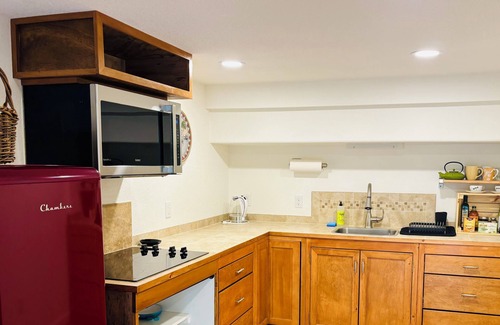 If you want to hole up and relax with your family, friends, colleagues, book, or art supplies, GreenHouse also offers a cozy home scene! Enjoy rustic trails, picnic table and barbecue, fruit trees and flowers, and the feeling that you've arrived into your own private nature preserve.