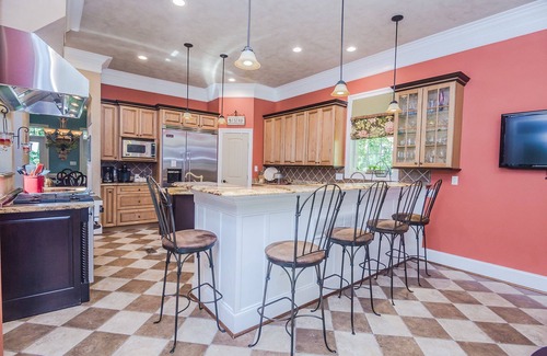 Gourmet Chef’s Kitchen: The fully stocked kitchen includes two dishwashers, a six-burner stove with griddle, and double ovens, allowing for seamless meal preparation for your bridal party or family gathering.