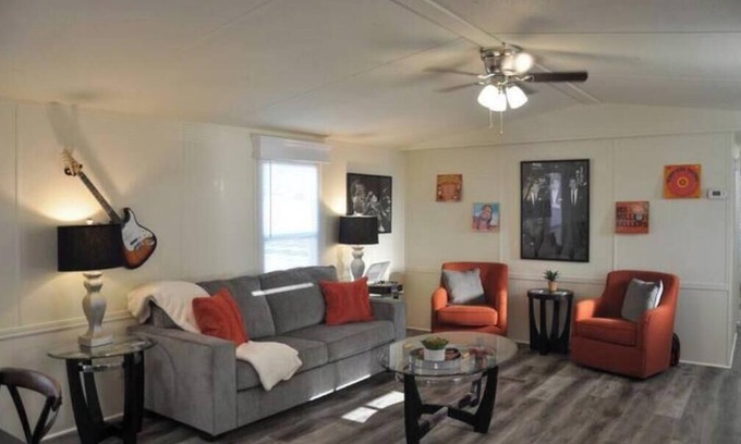Music-themed mobile home has been completely renovated with your comfort in mind! Conveniently located just 2 minutes from I-40, minutes from Lebanon, Gallatin, Mt. Juliet, and only a 25 minute drive to BNA Nashville Airport. Complete with fun touches like music-themed decor, a record player and albums by Nashville country music legends, and an outside sitting area. Pet friendly. Truly something for everyone in this place! Sleeps 8, so have fun with the whole family!