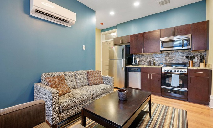 The unit features a cozy living room with a comfortable sofa, a flat-screen TV, and plenty of natural light. The bedroom boasts a plush full-size bed, a dresser, and a closet for ample storage. The bathroom is clean and modern with a shower/tub combo. The fully-equipped kitchen includes a refrigerator, stove, microwave, marble countertops, and coffee maker, along with all necessary cookware and utensils. Not to mention in-unit laundry!