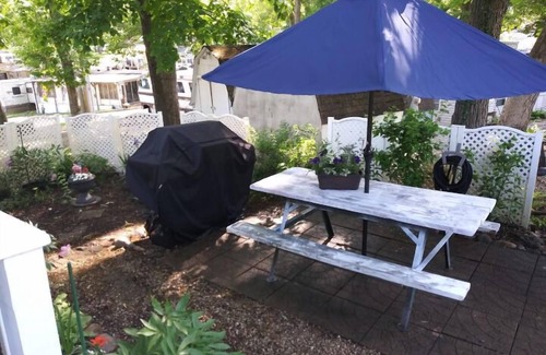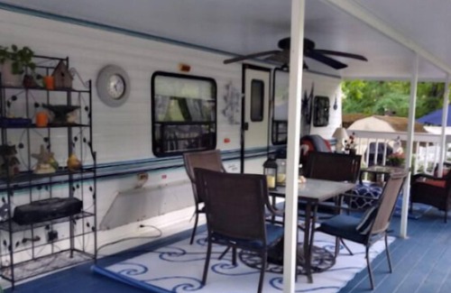 1 bedrooms with a queen size bed a couch that folds out into a full size bed, s( fire pit included you can rent a golf cart for an additional fee plan to activities two swimming pools tennis court shuffleboard grocery store on sight as well as a restaurant. Including a Beach. You can get a fishing license rent canoes paddle so a gas grill on site and plenty of room to park a small boat on the property one of the largest Lots in the park. +Golf cart is $50 a day with gas if you're interested please let me know I do have a zelle or you can send a check I'll contact you 2 weeks prior to your arrival please let me know in advance if you do need the golf cart thank you
