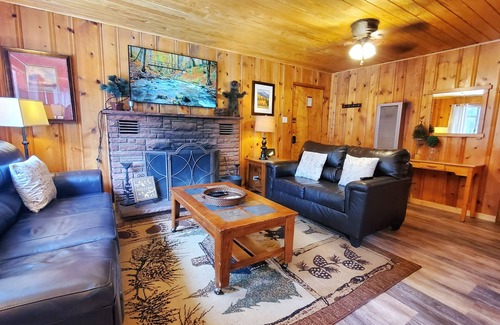 The Black Bear Cabin is designed with comfort and elegance in mind, featuring a fully-equipped kitchen, cozy wood-burning fireplace, and inviting living spaces. The spacious King bedroom and Queen bedroom ensure that you have ample room for relaxation, while the private outdoor hot tub adds an extra touch of luxury to your stay. Enjoy the scenic surroundings from the comfort of your own cabin or gather with loved ones around the fire pits or picnic tables by the river. Additionally, high-speed internet access keeps you connected during your stay.
