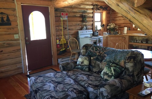 The cabin comfortably sleeps four people with one full size and one twin size bed in the loft bedroom plus a sleeper sofa in the front room. Bathroom includes shower. Living room has a TV with basic cable and internet service.