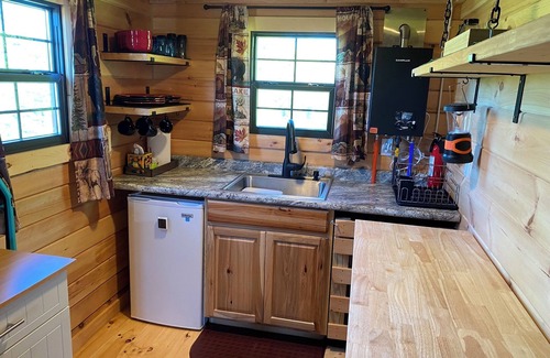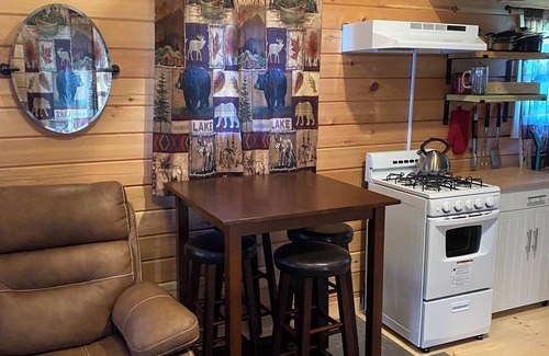 Bobcat Cabin is so named because of the beautiful feline caught on our trail cam shortly after installation. The log cabin is a 396 square foot vacation rental that can fit up to 4 adults. There is a queen bed in the downstairs, a full-sized bed in the loft (recommend only one person sleep in the loft, as the ceiling is low), and a convertible chaise-bed that can sleep one person. (We also have a pack-n-play available by request.)