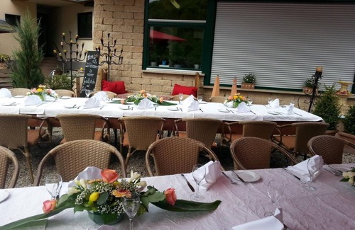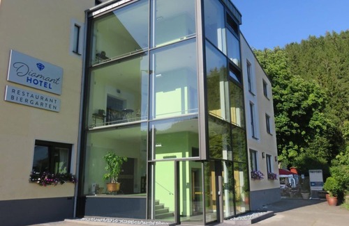 This 3-star hotel is on the outskirts of Idar-Oberstein, a 2-minute drive from the city center and a 5-minute drive from the Hunsrück Hochwald National Park. It offers free WiFi, free parking and a beer garden. The rooms at the Diamanthotel Idar-Oberstein are equipped with cable TV and a private bathroom. Wheelchair accessible rooms are also available. The rooms in the main building are accessible by elevator and the family rooms in the neighboring building have a separate entrance. A breakfast buffet is available every morning. The Handelshof and Grill Stube restaurants are open all year round, while the beer garden is open in summer. Hiking and cycling are popular activities in the nearby Saar-Hunsrück Nature Park. The ideal starting point for cycling and hiking tours. In summer, a beautiful garden, right by the forest, with a garden terrace and outdoor dining invites you to linger. Free parking spaces for cars and buses are located directly at the house and a garage for parking bicycles or motorbikes is also available. The cozy non-smoking rooms are equipped with a seating area, desk, flat-screen TV, telephone, alarm clock, kettle and hairdryer. The use of WiFi is available to guests free of charge. The rooms are ready for occupancy from 2:00 p.m. on the day of arrival and must be vacated by 10:30 a.m. on the day of departure. Restaurants Closed on Mondays, therefore arrival is only possible between 3 p.m. and 6 p.m. or by prior arrangement by phone. GPS Diamanthotel Idar-Oberstein49 ° 44´19N7 ° 16´52O