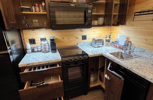 Experience the charm of a cozy, tiny-home-inspired cabin suite in the heart of downtown Sabetha. With warm log siding walls, exposed rustic beam ceilings, and a stunning limestone fireplace, this thoughtfully designed space offers the perfect mix of rustic ambiance and modern convenience. Provided by Limestone Lodge, it's ideal for a peaceful escape or productive work trip. Plus, you'll enjoy a prime location on Main Street near dining, shopping, and local attractions.