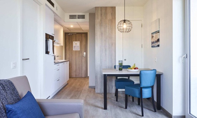 This Comfort Suite at Holiday Suites Zeebrugge is perfect for a trip for two. The suite has room for two people, who sleep wonderfully in a separate bedroom with double bed. You will also find a nice bathroom and an fully equiped open kitchenette. Sheets for the bed are provided, but the bed is not made up. Guests of Holiday Suites can use the swimming pool of the nearby hotel Ibis Styles.