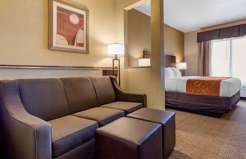 Comfort Suites Airport South offers 69 air-conditioned accommodations with coffee/tea makers and hair dryers. Beds feature Egyptian cotton sheets, down comforters, and premium bedding. Refrigerators and microwaves are provided. Bathrooms include shower/tub combinations with deep soaking bathtubs and hydromassage showerheads, and complimentary toiletries.