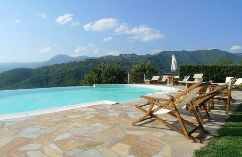 Outside there is a patio with table and loungers. The apartment boasts panoramic view of the dramatic Apuane Mountains. There is a wood oven and a BBQ in the garden.