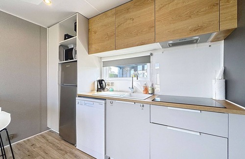 Let yourself be seduced by this 33m², 2-bedroom, high-comfort mobile home for 4 people. It features a living room with a fitted and equipped kitchenette, a lounge area with a TV and sofa, a master suite with a double bed (160x200) with a toilet and shower room, and a second bedroom with two single beds (90), a shower room, and a separate toilet. You can enjoy the fully equipped wooden terrace.