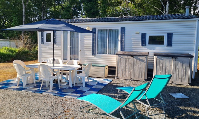 Comfortable 4-seater mobile home is located in Saint-Yvi. Comfortable 4-seater mobile home provides accommodation, featuring Parking, Pool, Ocean View, among other amenities. This House features Parking, Pool, Ocean View, to make your stay a comfortable one.