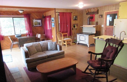 The cabin has two renovated bedrooms, a renovated bathroom with a shower and tub, and a combined living area and kitchen with a wood cook stove, gas fireplace insert, and an electric organ. Outside, there are three levels of deck.