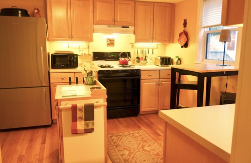 Cheery eat-in kitchen with all the equipment and appliances you can imagine, dining room, and spacious sun-dappled living room. Good sized and comfortably-appointed bedrooms located at opposite ends of the unit, one queen bed, one double. Great yard and gardens to relax in. Fire TV Stick with Alexa Voice Remote for streaming on the flat screen - sign in on the Fire Stick and stream your own Netflix, Amazon Prime or HBO GO, XfinityGo, etc. Walk to MIT, Harvard, Boston, great restaurants every which way. Heat, hot water, electric, AC, Internet. Red Line and Green Line MBTA nearby. A short walk to MIT, Harvard, Boston, and many great restaurants a stone's throw away.