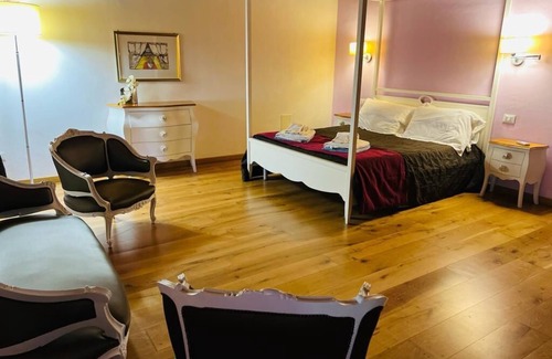 The apartment features a mix of rustic and elegant styling, including exposed-beam ceilings and pastel-colored fabrics, creating a relaxing and welcoming atmosphere. It comes with two bathrooms, one of which includes a hot tub, perfect for unwinding after a long day.