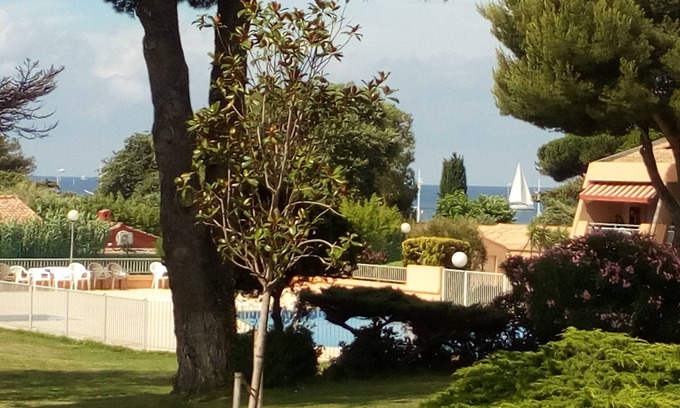 Provençal charm, family friendly apartment on the Mediterranean Sea, Côte d'Azur - Provence, between St. Tropez and the Camarque, with high comfort: deutschspr. Care, comfortable for up to 4 adults + 2 children (6 sleeping possibilities in 3 different rooms); Swimming pool - swimmer, non-swimmer and baby pool, shower, seating and lounges -, tennis, pétanque, table tennis. Private parking lot right next to the apartment in the enclosed complex, sandy beach in 100m, on the 'most beautiful bay of Europe': Rade de Toulon, landscape beauty: little concrete, the pines go into the water; Mediterranean park, large partly covered south terrace - i. They have the whole day both sunbathing and shaded - with garden table, 6 garden chairs and 3 sun loungers, with kl. Internet, WIFI, WIFI, WIFI, WIFI, Telephone, SAT TV for all German TV and radio, Programs, all French and many international TV and radio stations, use facilities of the complex, such as pool, tennis, table tennis, petanque and final cleaning!