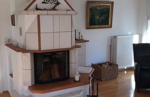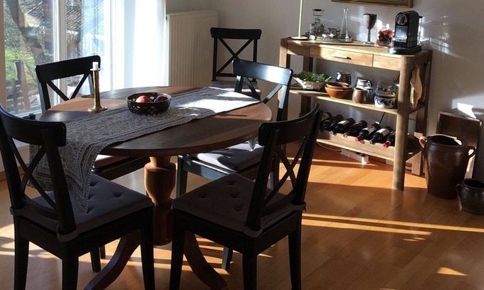 Approx. 80 sqm, very sunny apartment on the 1st Upper floor of a former stable building. 46 sqm living-dining area with fireplace. Perfectly equipped kitchen.