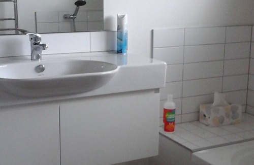 The main bedroom is quiet and sunny. It links into the renovated bathroom, which has a great shower plus a bath. There is a TV available in the main bedroom.
