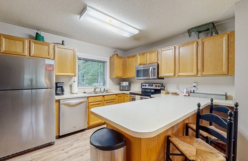This mountain condo located in Big Sky's Mountain Village is 1000 square feet and has two bedrooms and two bathrooms. Condo highlights include budget-friendly rates with ski access and complimentary wireless internet. Once you enter up two stairs, the condo is all on one level. The kitchen, dining area, and living room are all open to each other, making it easy to hang out with everyone in your group after a day of skiing or hiking.